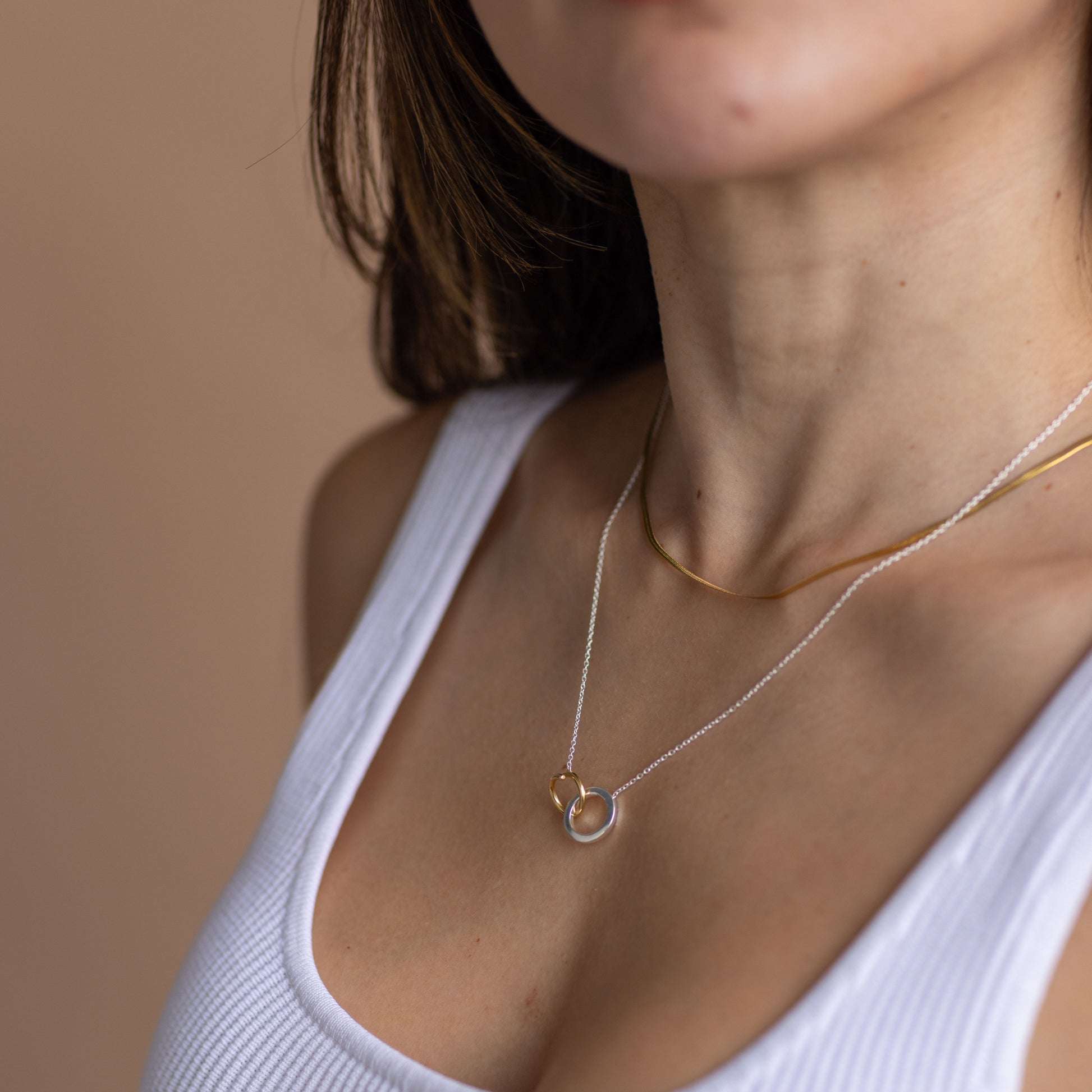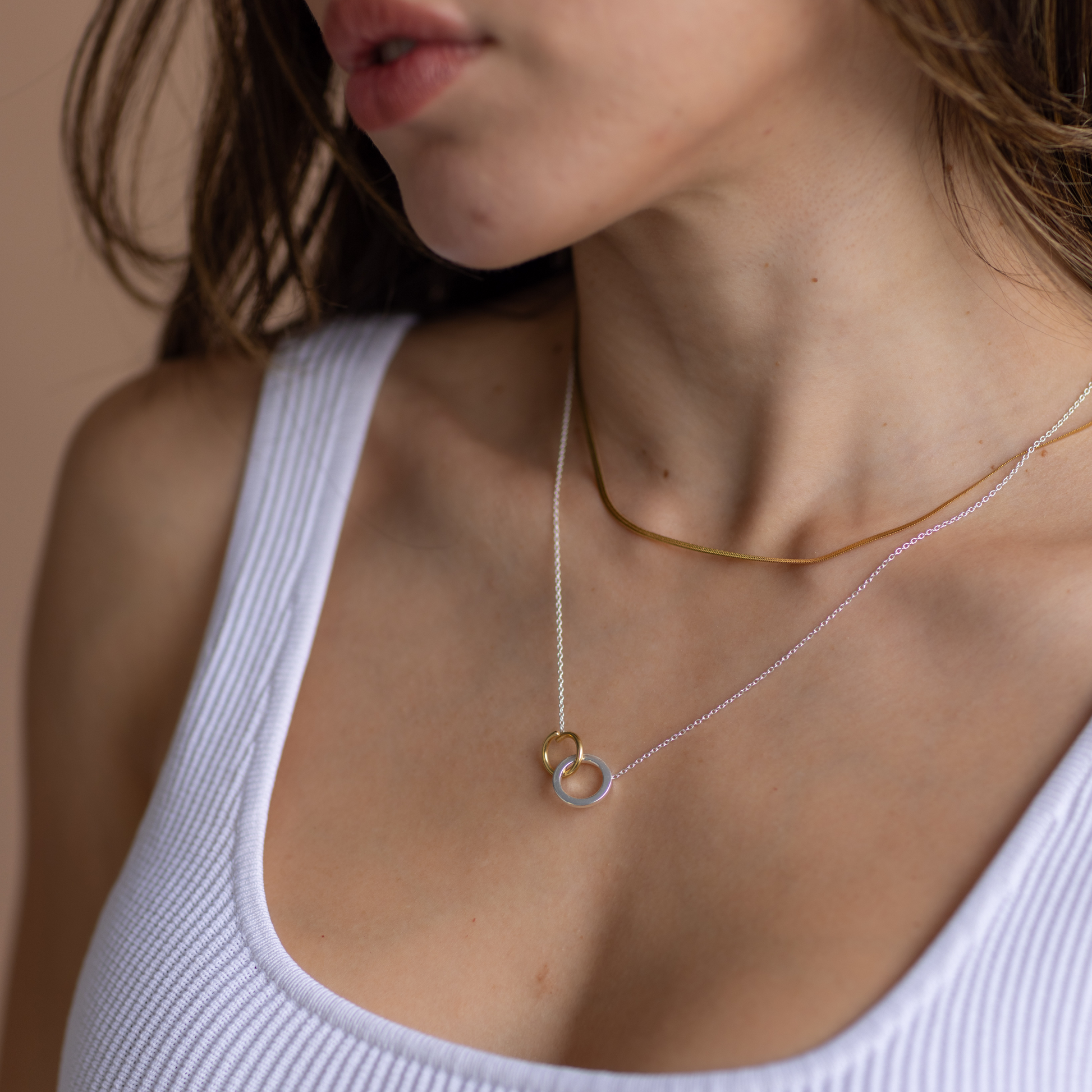 This necklace represents the duality of the mixed experience. Though the rings are different in color, shape, and size, they are joined at the front clasp. The juxtaposition represented by the rings is what makes the necklace beautifully unique, just like you.